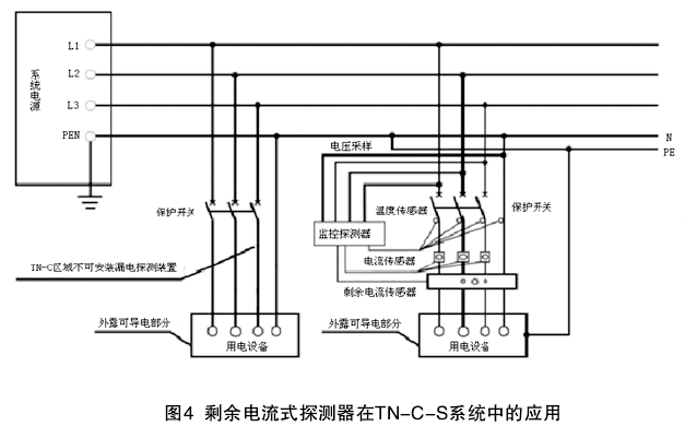 電氣火災(zāi)監(jiān)控探測器的剩余電流動作保護(hù)必須與配電系統(tǒng)的接地形式相配合,其適用于TN-S接地系統(tǒng)、TT接地系統(tǒng)。如需在TN-C接地系統(tǒng)探測剩余電流時,應(yīng)將TN-C系統(tǒng)改造成TN-C-S,則剩余電流動作保護(hù)裝置應(yīng)設(shè)置在PE線N線分開(見圖4)。