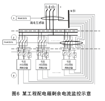 一方向同時均勻穿過剩余電流探測器(見圖6):區(qū)域①安裝漏電互感器PMAC503M,此時漏電互感器穿線A、B、C、N;區(qū)域②安裝漏電互感器PMAC503M,在安裝漏電互感器時,穿過的零線應(yīng)為三極斷路器對應(yīng)供電回路的中性線;區(qū)域③出線回路一旦出現(xiàn)某條線路的零線沒有接回本配電箱零排,或其他配電箱的零線接至本配電箱的零排,則會導(dǎo)致進(jìn)線處漏電監(jiān)測值的不正常,有可能引起開關(guān)跳閘、探測器錯誤動作等嚴(yán)重后果。