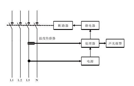 溫度傳感器一般放在配電箱中或者貼于電纜表面;在檢測溫度時,傳感器以一定的時間對溫度傳感器檢測的溫度進(jìn)行讀和寫,若連續(xù)幾次檢測溫度大于0.9倍溫度報警設(shè)定值,則認(rèn)定溫度過高,處理器發(fā)出聲光報警信號,若設(shè)置了自動脫扣,則探測器會自動切斷斷路器(見圖2)。