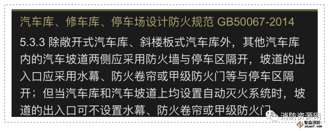 綜上可知,汽車庫直接對外的車道出口部位,是否需要采取防火分隔措施,或設(shè)置自動滅火系統(tǒng),需要根據(jù)汽車庫出口與建筑物的防火間距確定。